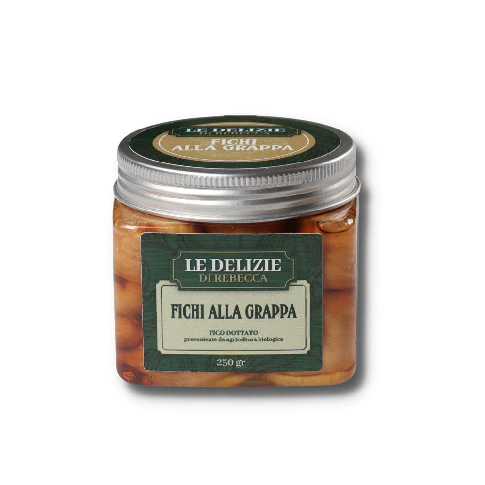 Fichi essiccati al naturale, cotti al forno e immersi nella Grappa.